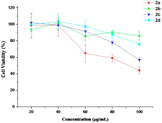 The cytotoxic activities of these complexes were tested by the CCK8 method, and evaluated in HL-7702 cells. As shown in Figure 14, none of them displayed serious cytotoxicity in this cell-line. The relative cell viability of 2b or 2d was more than 70% when the concentration was over 100 mg/mL. To our surprise, two Cu2+ complexes showed relative high cytotoxicity in the cell-line. Data obtained from in vitro and cell culture studies were largely supportive of copper′s capacity to initiate oxidative damage and interfere with important cellular events [36], but the results also reflected that all of these complexes 2a–d showed relative low toxicity to normal human hepatic cells at high concentration, and dinuclear compounds were safe for further applications.