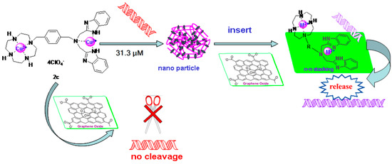 As for GO regulation of the interaction between DNA and complex, the π-π stacking was the key factor, and complex adhered to GO by Cu2+-IDB which led to DNA release. Although the mononuclear compounds also have the benzimidazole group shown in Figure 1, they cannot condense DNA. Furthermore, cyclen complex conjugated with one or two big aromatic ring structures, such as anthracene [33] and acridine groups [34], always show DNA cleavage abilities. IDB had advantages over tridentate ligands like tris(benzimidazol-2-ylmethyl)amine (NTB) or ligands possessing four benzimidazole groups like N,N,N′,N′-tetrakis(benzimidazol-2-ylmethyl)-1,2-ethanediamine (EDTB), because of the internal angle between two benzimidazoles of Cu2+-IDB was nearly 180°, as verified by the single crystal structure [31] and the internal angles of benzimidazoles in NTB and EDTB were about 120° [18], so it was even greater in IDB than in NTB and EDTB. As we know, Cu2+-IDB and Cu2+-cyclen coordinated with one H2O each as confirmed by elemental analysis to maintain individual architecture stabilization, and the p-xylyl group as linker forced two nuclei away from each other, so there might be no interference between them. The benzyl group as linker also did not participate in coordination, and each cationic nucleus of the hybrid complex 2c would keep its original configuration. Moreover, the benzyl linker might provide extra π-π stacking. It is also important to point out that the π-π stacking between two independent benzimidazoles has been proven [12] and the effect should be strong enough for GO to conjugate with dinuclear complexes. Figure 11 and Figure 12 also show that when complex 2c and DNA were incubated in an EP tube together, no matter the DNA complex formed or approaching cleavage by electrostatic interaction, the GO could hinder the two interacting models. There was nearly no Form II or Form III DNA present and structures at the concentrations for cleavage were almost superhelical. Furthermore, it also can be found that the electrostatic interaction which is the key effect for commonly used gene delivery agents to condense DNA was relative weaker than the π-π stacking action. The possible mechanism of DNA release and cleavage hindrance by the complex 2c is shown in Scheme 3.