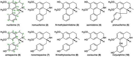 The active CHCl3-soluble fraction was subjected to normal-phase silica gel, reversed-phase ODS column chromatography, and finally HPLC to furnish nuciferine (1, 0.1028%) [2,5,6], nornuciferine (2, 0.0821%) [2,5,6], N-methylasimilobine (3, 0.0094%) [2,7], asimilobine (4, 0.0345%) [2,6,8], pronuciferine (5, 0.0195%) [2,9], armepavine (6, 0.0170%) [2,10], norarmepavine (7, 0.0616%) [10,11], N-methylcoclaurine (8, 0.0053%) [12], coclaurine (9, 0.0042%) [10,13], and norjuziphine (10, 0003%) [14] (Figure 1).