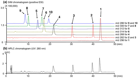 A typical LC-MS chromatogram of a standard solution mixture (each 10 µg/mL) of alkaloids (1–10). (a) SIM chromatogram (positive ESI); (b) HPLC chromatogram (UV: 260 nm).