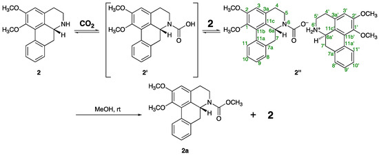 Chemical transformation of nornuciferine (2) into its ammonium carbamate salt (2′′) and to methyl carbamate (2a).