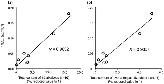 Correlations between the melanogenesis inhibitory activities and total content. (a) Total content (%) of 10 alkaloids (1–10); (b) Total content (%) of two principal alkaloids (1 and 2). Total contents (%) of the alkaloids are presented in values reduced to the content of nuciferine (1), calculated based on the ratio of IC50 values (µg/mL) against melanogenesis inhibitory activities.