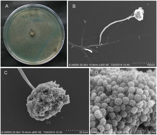 Colony appearance and micromorphology of A. niger SCSIO Jcsw6F30. (A) Colony appearance after seven days at 25 °C (MB); (B,C) Conidiophores after seven days at 25 °C under SEM; (D) Conidia as seen using SEM.