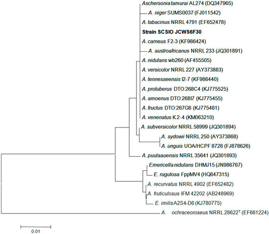The neighbor-joining tree based on ITS1-5.8S-ITS2 sequences, showing the phylogenetic relationship between strain SCSIO Jcsw6F30 and related species. GenBank accession numbers are given in parentheses. Bar: 1% sequence divergence.