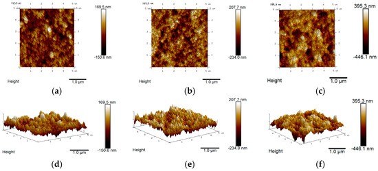 AFM top view images and 3D maps of (a,d) unmodified, (b,e) 5% and (c,f) 10%-Ti modified hematite electrodes.