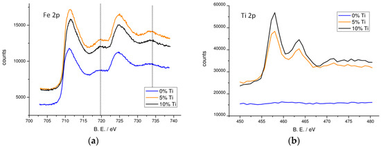 In order to analyze the surface of the material in search of changes upon Ti incorporation, both unmodified and Ti-modified (5% and 10%) hematite films have been investigated by XPS. Binding energies (B.E.) were calibrated on C1s peak (B.E. = 284.8 eV) (Figure S1 in the Supplementary Materials). The XPS spectra of the Fe 2p core are reported in Figure 2. They exhibit binding energies of 711.3 and 725.0 eV corresponding to the Fe 2p3/2 and Fe 2p1/2 lines, respectively. Typical Fe3+ shake-up satellites appear correctly separated by 8 eV from the main Fe 2p peaks (dotted bars in Figure 2a) [33], indicating that Fe3+ is the dominant ionic species in all the films. In the Ti(IV)-modified samples (orange and black lines) it is difficult to detect the presence of Fe2+ species which would result from incorporation of titanium in the hematite lattice (Fe3+ + Ti4+ → Fe2+ + Ti3+) [34] due to the range of diagnostic binding energies for Fe2+ species which substantially overlap with the much stronger Fe3+ peaks. Furthermore, the Fe 2p signals do not exhibit substantial peak shifts upon Ti incorporation, suggesting that Fe3+ cations experience a quite similar chemical neighborhood in both the modified and un-modified samples. Figure 2 also shows the Ti 2p core signal for the modified samples, split into the 2p3/2 (B.E. = 458.7 eV) and 2p1/2 (B.E. = 464.4 eV) peaks. No peaks are detected in this region for the un-modified hematite film (blue line in Figure 2b). The presence of the two Ti 2p components is consistent with the valence of Ti4+ in a titanium oxide phase [29], however the FWHM of these peaks (1.47 eV) is larger with respect to a pure TiO2 (rutile) film (1.32 eV) reflecting the presence of multiple slightly different chemical surroundings of the Ti(IV) oxide phase cast on the surface of hematite films (Figure S2). The relative intensity of Ti 2p peak, evaluated with respect to the Fe 2p signal, increases from 31% to 50% by moving from the 5% to the 10% Ti-modified samples, indicating a thicker titanium oxide surface layer for the 10% Ti-modified sample. The relative Ti/Fe intensity only slightly changes when analyzing the electrodes with a 20° take off angle suggesting a good surface homogeneity in the different samples: the Ti/Fe ratio observed at 20° and 45° is nearly constant in the 5% sample whereas it increases by about 15% when observing the 10% Ti-modified sample at the lower take off angle, suggesting, in this latter case, the formation of a thicker titanium oxide layer.
