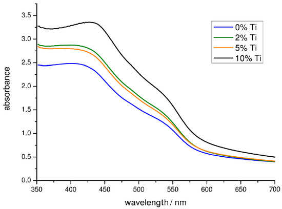 UV-Visible spectra of unmodified and Ti-modified hematite electrodes (2%, 5% and 10%).