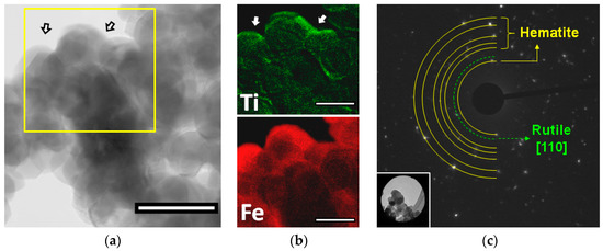 High resolution TEM and SAED imaging. (a) TEM micrograph of 10% Ti-modified hematite sample (100 nm scale bar); (b) related ESI elemental distribution maps for Ti and Fe (50 nm scale bars); (c) Electron diffraction analysis of selected area (in the figure inset below) of 10% Ti-modified hematite sample. The arrows indicate the SAED sampling zones.