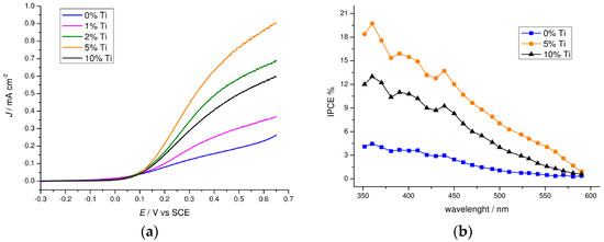 Photoelectrochemical measurements on Ti-modified hematite thin films. (a) J–V response of un-modified and Ti(IV)-modified hematite samples under AM 1.5G illumination (100 mW·cm−2) in NaOH 0.1 M. Nominal titanium concentrations are reported in the legend. (b) IPCE spectra of un-modified (0%) and 5% and 10% Ti-modified hematite electrodes recorded at 0.6 V vs. SCE in 0.1 M NaOH (pH 13.3).