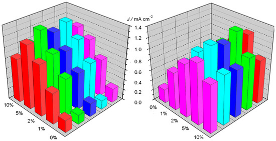 In order to understand the effect of the Ti(IV) addition during the electrophoretic deposition of the iron oxide nanoparticles, we compared the photocurrent density vs. potential recorded in 0.1 M NaOH (pH 13.3) under AM 1.5G continuous illumination (100 mW·cm−2) shining from the FTO side. Interestingly, the introduction of titanium(IV) butoxide results in a significant enhancement of the anodic photocurrent for all the modified hematite samples in comparison with the un-modified hematite (Figure 6a). As the percentage of titanium precursor is increased from 0% to 5%, the photocurrent increases from ca. 0.25 mA·cm−2 up to 1.0 mA·cm−2 at 0.65 V vs. SCE, decreasing again at larger percentages, probably due to the increased thickness of the TiO2 insulating layer. The performance of un-modified hematite is in excellent agreement with previous results obtained using the same deposition technique [8], with a very good reproducibility among different samples (Figure 7). IPCE spectra recorded at 0.65 V vs. SCE confirmed the superiority of the 5% Ti-modified samples, producing a 4-fold improvement of the external quantum yield with respect to simple hematite (Figure 6b), in good agreement with the J–V behavior. Given that the absorption at wavelengths <600 nm are for all the samples quantitative (Figure 3), differences in IPCE values are thus ascribable to different charge transfer and charge collection properties, resulting from a lower percentage of photogenerated carriers lost by recombination in the Ti-modified samples.