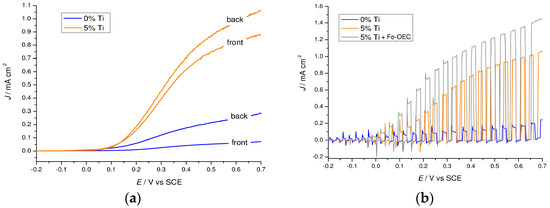 Illumination from the electrolyte side (front side) reduced dramatically the photocurrent in the unmodified hematite, limited to less than 0.1 mA·cm−2 at 0.65 V vs. SCE, while this effect is less pronounced in the 5% Ti-modified samples (Figure 8a). Given that the light penetration depth of hematite is reported to be 118 nm at 550 nm, illumination from the electrolyte side generates charge carriers far from the FTO contact resulting in a poor electron collection ability. The presence of titanium oxide significantly alleviates this problem, probably through a variety of effects which include reduction of the grain boundaries, passivation of the surface trap states and surface field effects which cannot be discerned through the analysis of the J–V characteristics. After the Surface Ionic Layer Adsorption and Reaction (SILAR) deposition of the iron(III) oxygen evolving catalyst (Fe-OEC) on the 5% Ti-modified photoanode, a 40% increased photocurrent is achieved at 0.65 V vs. SCE, coupled with a ca. 100 mV cathodic shift on the onset potential (Figure 8b). The discontinuous amorphous iron oxide islands onto the hematite surface were demonstrated to store oxidizing equivalents in reactive states exposed to the electrolyte enhancing charge separation [5], consistent with increased photocurrent. Evolution of small oxygen bubbles at the photoanode during constant potential photoelectrolysis (0.15 V vs. SCE) was evident by visual inspection and confirmed with an electrochemical oxygen probe (Figure S3).