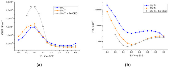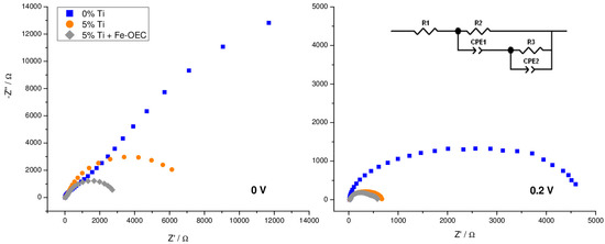 EIS was performed by scanning the J–V characteristic under illumination, between −0.1 and 0.6 V vs. SCE, where photocurrent generation occurs, in order to highlight the role of titanium oxide surface layer and to address the active elements responsible for charge generation and separation. The best performing Ti-modified electrode (5% Ti-modified sample) was selected for such investigation. Electric equivalents to fit EIS data comprise a nested circuit where two parallel meshes model the charge transfer across the space charge region and the hole transfer through surface trapped intermediates (inset Figure 9). Typical Nyquist plots for the two samples are exemplified in Figure 9, where two different representative potentials along the J–V curve were chosen: close to the photocurrent onset (0 V vs. SCE) and in the rising part of the J–V curves (0.2 V vs. SCE).