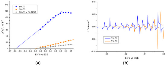 The high frequency capacitance follows indeed a MS behavior from which the doping density of the films can be extracted (Figure 11a): although the MS intercept should be taken with caution, due to local surface effects on the dielectric constant of hematite, it provides a doping density 3 times higher for the 5% Ti-modified sample with respect to the un-modified hematite (5.04 × 1018 and 1.87 × 1018 cm−3 respectively) resulting in a thinner but deeper depletion layer, where the stronger electric field near the surface facilitates hole extraction. Further, the presence of a stronger surface dipole in the Ti(IV)-modified samples, instrumental in favoring charge separation, is consistent with the positive shift (ca. 400 mV) of the flat band potential in the Ti-modified film, which agrees with the anodically shifted photocurrent transients observed in the −0.35–0 V vs. SCE interval (Figure 11b). Thus EIS data indicate that local electric field effects induced by the presence of pure or mixed titanium oxide surface phases are mainly responsible for enhanced interfacial hole transfer in this type of modified hematite films.