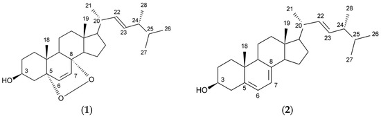 - Kim, S.W.; Park, S.S.; Min, T.J.; Yu, K.H. Antioxidant activity of ergosterol peroxide (5,8-epidioxy-5a,8a-ergosta-6,22E-dien-3b-ol) in Armillariella mellea. Bull. Korean Chem. Soc. 1999, 20, 819–823. [Google Scholar]