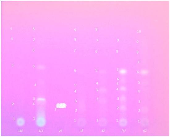 | TLC Band | The Color under UV Light at 365 nm/degree of Discoloration W1 | Fraction | Rf Range |