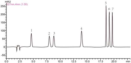 HPLC-PDA chromatogram of (1) 5-caffeoylquinic acid; (2) 3-caffeoylquinic acid; (3) 4-caffeoylquinic acid; (4) 1,3-dicaffeoylquinic acid; (5) 3,4-dicaffeoylquinic acid; (6) 3,5-dicaffeoylquinic acid; (7) 4,5-dicaffeoylquinic acid.