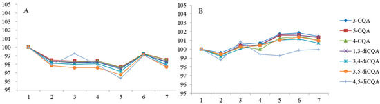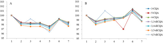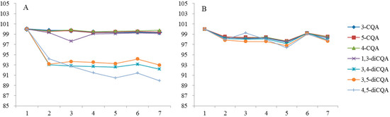 Photostability of CQAs in solution of 50% (v/v) aqueous methanol stored at 4 °C. (A) Brown bottle; (B) Transparent bottle.