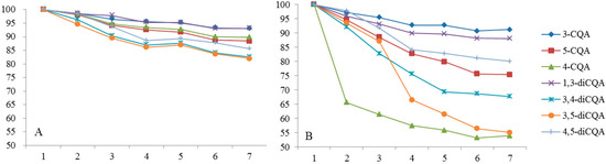 Thermal stability of CQAs in solution of 50% (v/v) aqueous methanol stored at brown bottle. (A) Room temperature; (B) 4 °C.