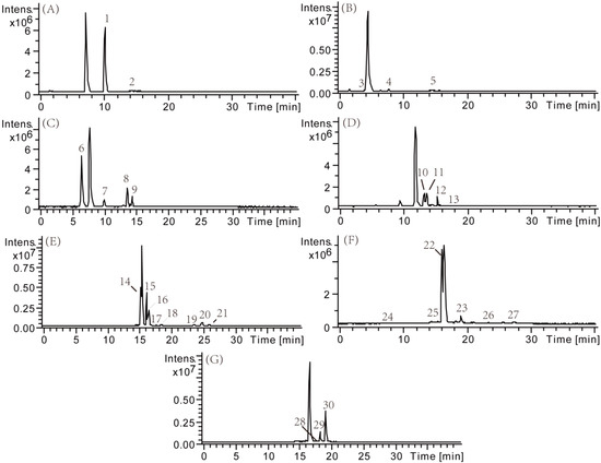 Total ion current chromatograms of 7 CQAs and its degradation products stored in transparent bottle at room temperature after 7 days. (A) 5-caffeoylquinic acid; (B) 3-caffeoylquinic acid; (C) 4-caffeoylquinic acid; (D) 1,3-dicaffeoylquinic acid; (E) 3,4-dicaffeoylquinic acid; (F) 3,5-dicaffeoylquinic acid; (G) 4,5-dicaffeoylquinic acid.
