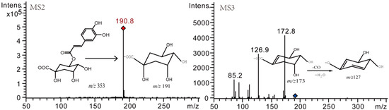 Dehydrated production of mono-acyl CQAs were detected by LC-MS as well. Both degradation products of 3-CQA and 4-CQA afforded their prominent [M − H]− ion at m/z 335 and MS2 base peak ion at m/z 161. The difference between the [M − H]− ions at m/z 335 and quasi-molecular ion of their prototypes at m/z 353 was 18 Da, indicating the neutral loss of a H2O (Figure 10). Similarly, compounds 5 and 9 were finally identified as dehydrated 3-CQA and dehydrated 4-CQA, respectively [18].
