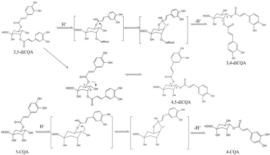 Acyl migration mechanism of 4,5-diCQA ⇋ 3,5-diCQA ⇋ 3,4-diCQA and 5-CQA ⇋ 4-CQA ⇋ 3-CQA.