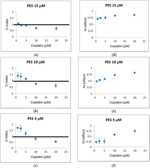 CI values for pifithrin-μ (PES) at 15 µM (a); 10 µM (b) and 5 µM (c) in combination with 1, 2.5, 5, 10, and 20 μM cisplatin against HT29 cells. CI (Combination index) is a quantitative definition for synergism where CI < 1, antagonism where CI > 1 and additive effect where CI = 1. The average ± SEM of three independent experiments relative to control, ≤0.2% DMSO treated cells. Fa effect for pifithrin-μ (PES) at 15 µM (d); 10 µM (e) and 5 µM (f) in combination with 1, 2.5, 5, 10, and 20 μM cisplatin. Fa (fraction affected) represents the respective proliferation inhibition, where 0% inhibition fa = 0% and 100% inhibition fa = 1. The average ± SEM of three independent experiments relative to control, ≤0.2% DMSO treated cells.