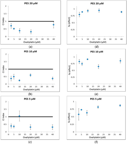 CI values for pifithrin-μ (PES) at 20 µM (a); 10 µM (b) and 5 µM (c) in combination with 2.5, 5, 10, 20 and 40 μM oxaliplatin against HT29 cells. CI (Combination index) is a quantitative definition for synergism where CI < 1, antagonism where CI > 1 and additive effect where CI = 1. The average ± SEM of three independent experiments relative to control, ≤0.2% DMSO treated cells. Fa effect for pifithrin-μ (PES) at 20 µM (d); 10 µM (e) and 5 µM (f) in combination with 2.5, 5, 10, 20 and 40 μM oxaliplatin. Fa (fraction affected) represents the respective proliferation inhibition, where 0% inhibition fa = 0% and 100% inhibition fa = 1. The average ± SEM of three independent experiments relative to control, ≤0.2% DMSO treated cells.
