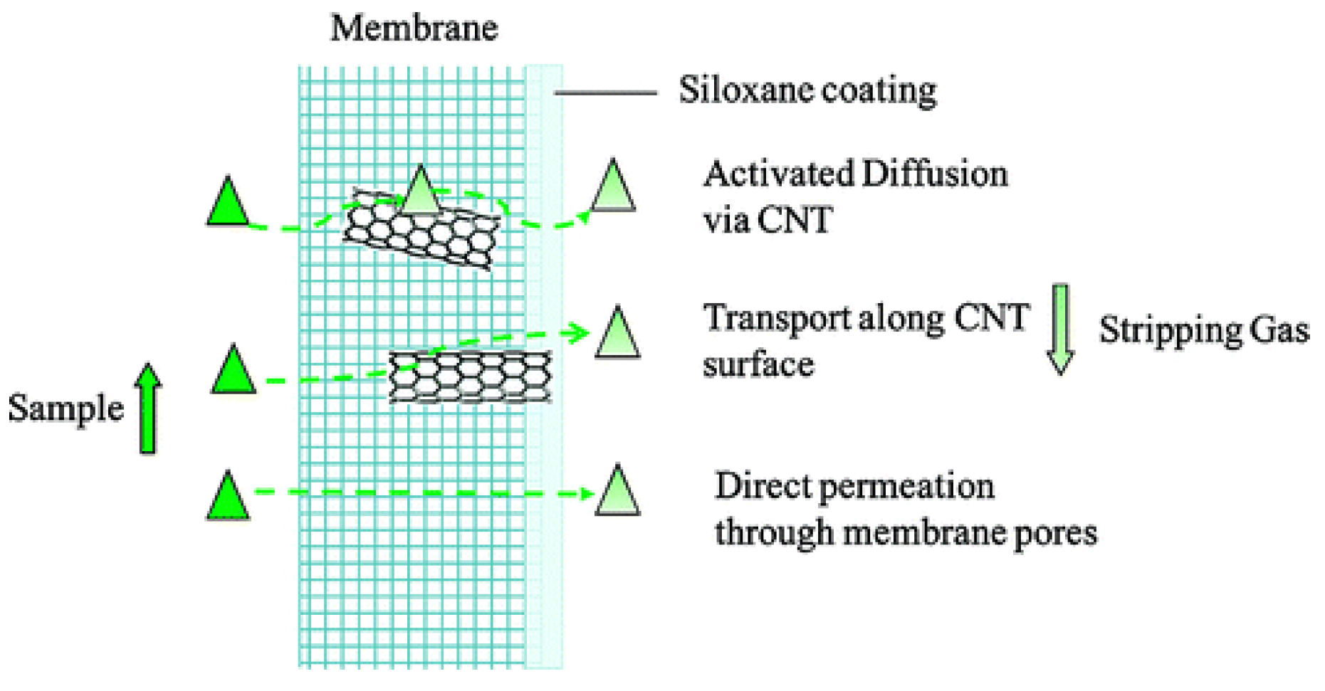 Effect of carbon nanotubes (CNTs) in membrane based pervaporation process. Analytes are represented by triangles. Reprinted with permission from Ref. [30]. ©2010 American Chemical Society.