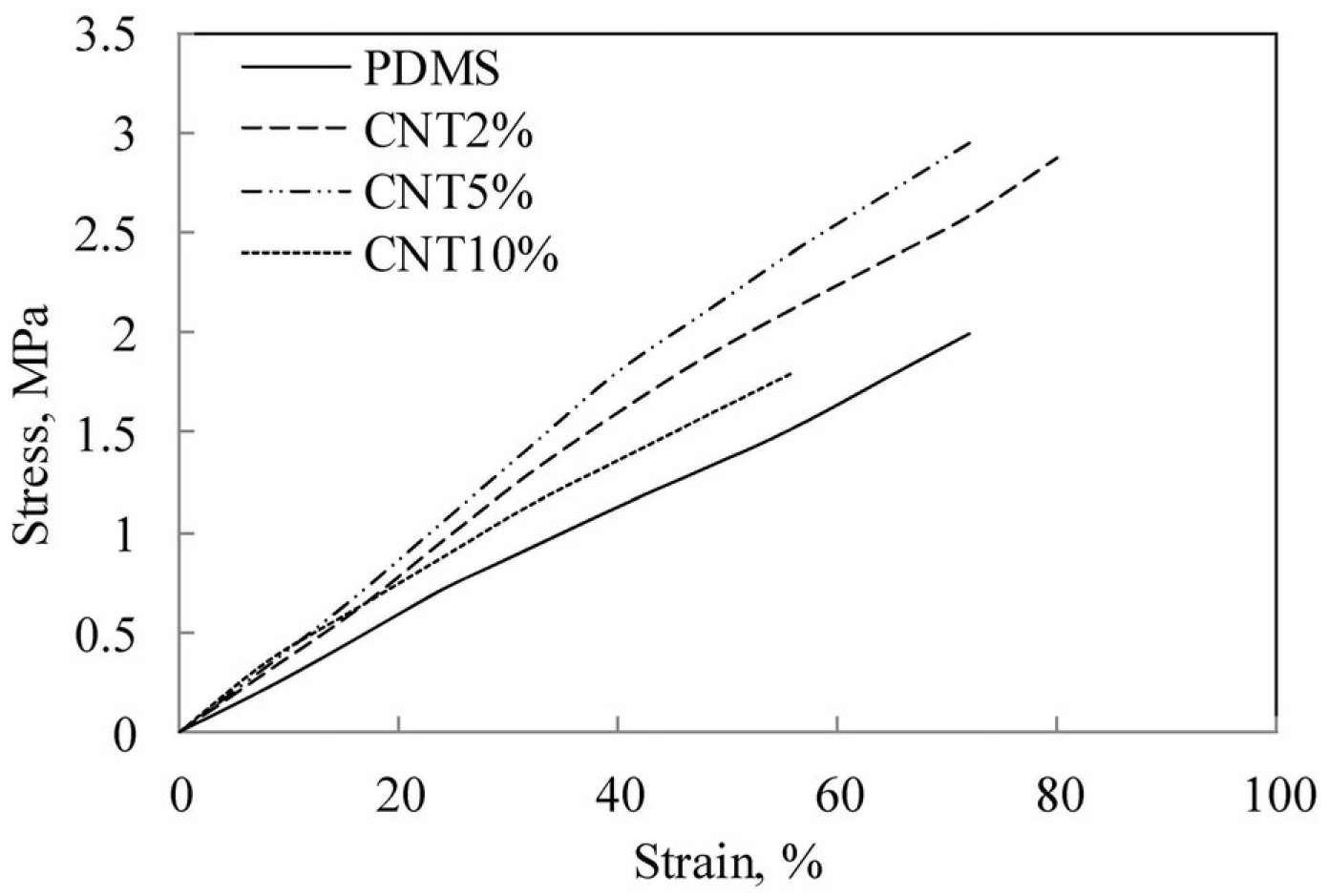 Stress strain curves with CNT loading for polydimethylsiloxane(PDMS) matrix membranes. Reprinted with permission from Ref. [40]. ©2014 Nature Publishing Group.