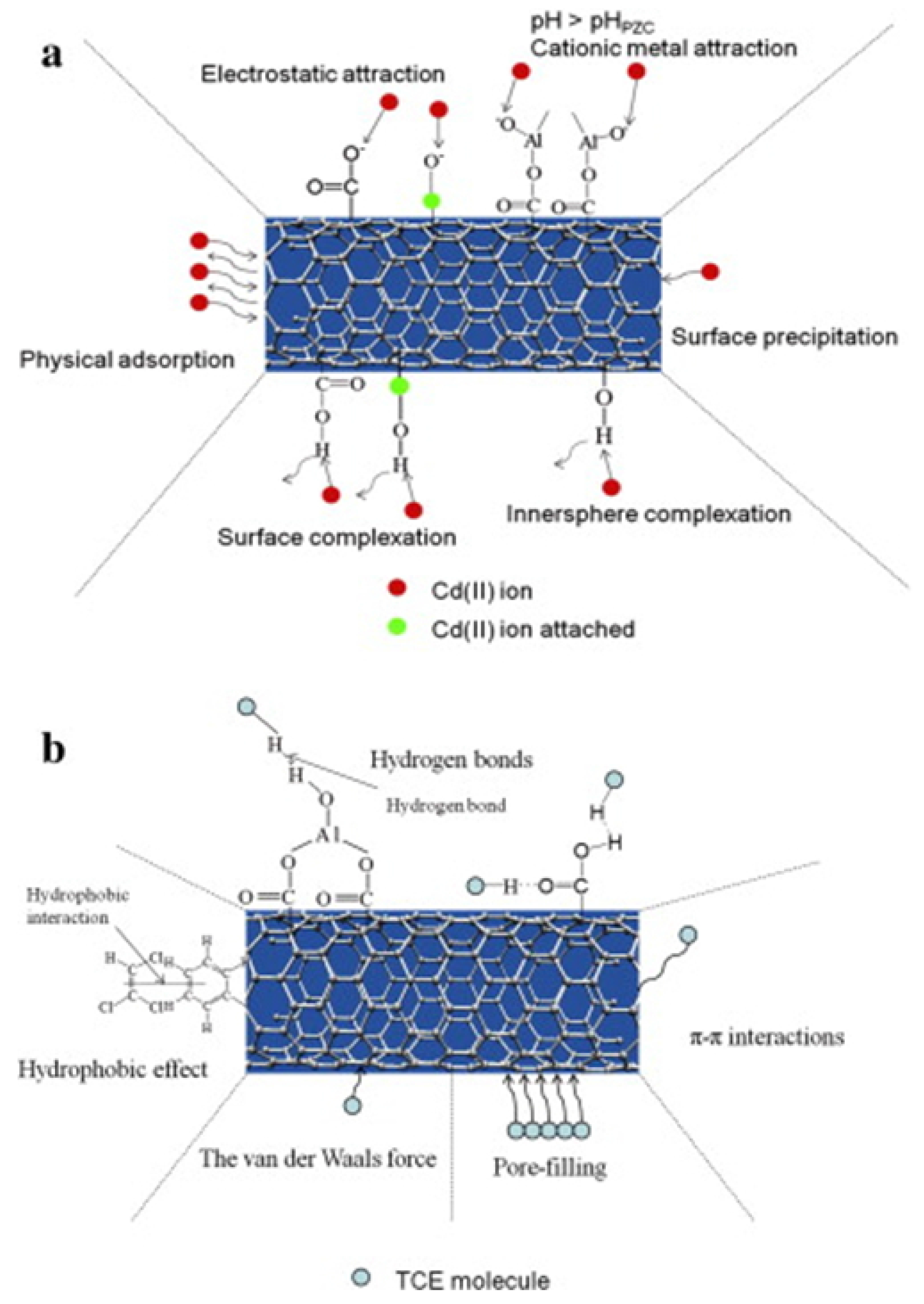 Interaction of alumina coated MWCNTs with (a) Cd(II) ion, and (b) TCE. The schematic shows the range of interactions that contribute to adsorption processes in hybrid, hierarchical systems. Reprinted with permission from Ref. [41]. ©2015 Elsevier.
