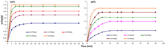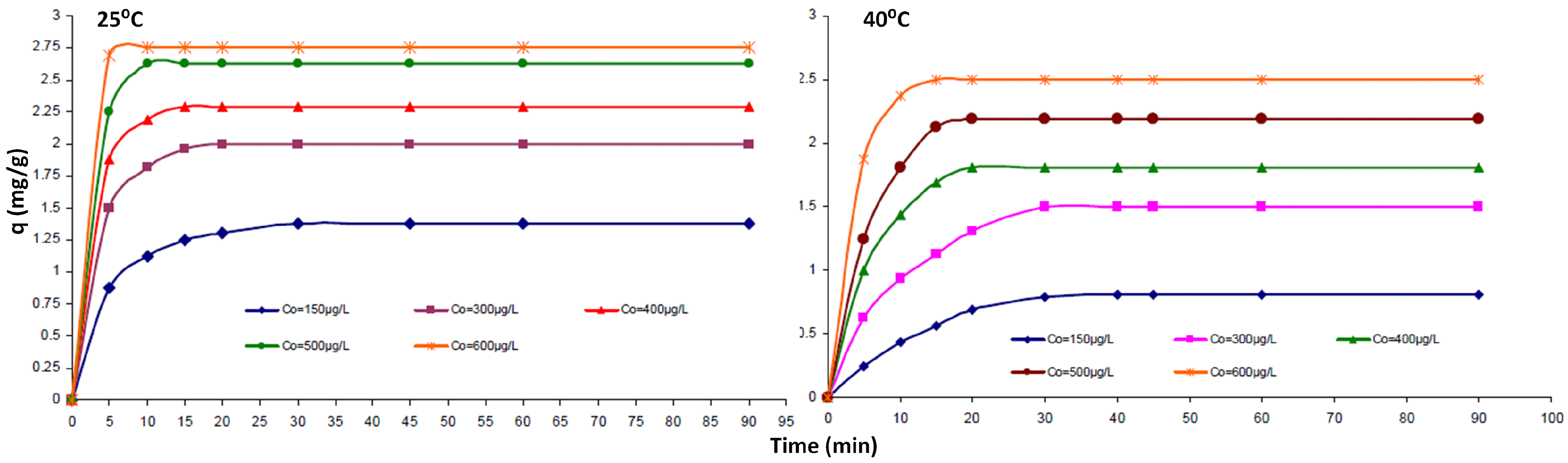 For the specific case of MWCNT–TCE interactions, there was a decrease in adsorption of TCE with temperature as shown in Figure 5. This points to a mechanism of physisorption, which was also observed by Tanada et al. [44] for activated carbon fiber. In the case of alumina coated CNTs, the change in pH does not affect the adsorption of TCE, while it has a marked effect on the adsorption kinetics of Cd(II) [41], also pointing to a physisorption based mechanism for TCE. Physisorption would be guided by molecular matching to the substrate (soft epitaxy) and change in planarity of the particular molecule (or COC) would change the non-covalent interactions that determine such adsorption.