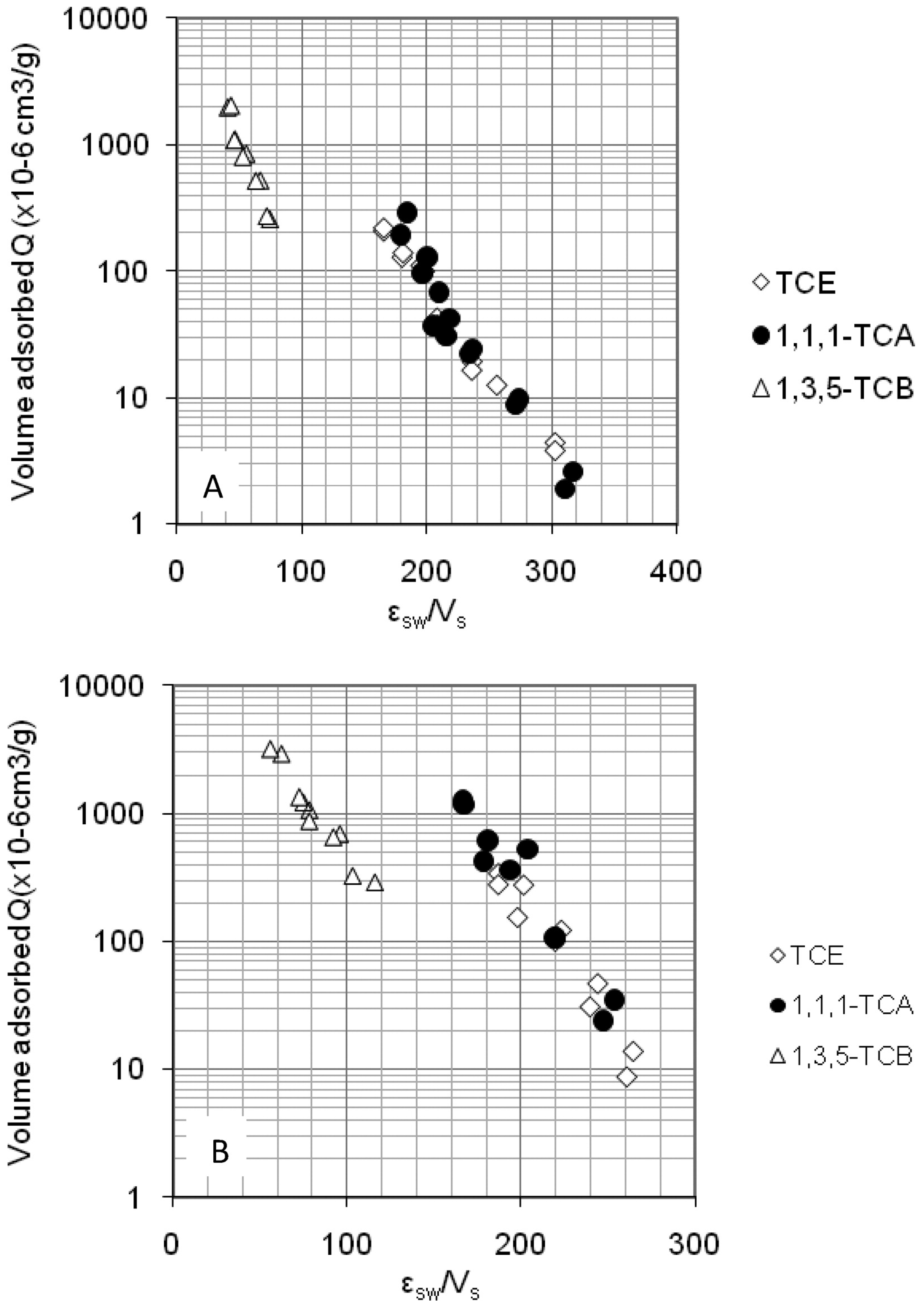 Correction curves for pristine (top) and heat treated (bottom) MWCNTs for adsorption of TCE, 1,1,1-1, 1, 1-trichloroethane(TCA) , and 1,3,5-trichlorobenzene TCB. Reprinted with permission from [45]. ©2015 American Chemical Society.