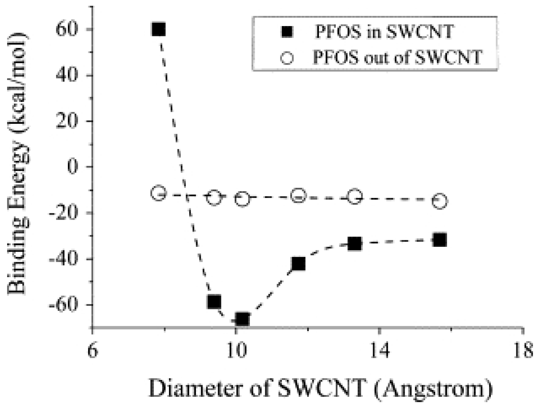 Diameter dependence on binding energies of perfluorooctane sulfonate (PFOS), inside and outside of SWCNTs. Reprinted with permission from [47]. ©2013 Elsevier.