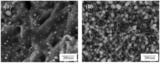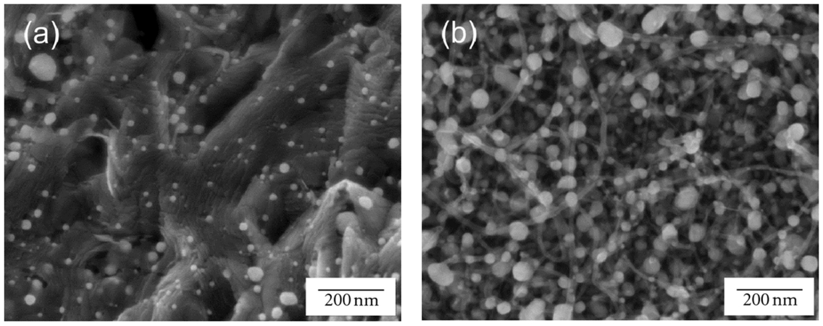 SEM micrographs of two different hierarchies: (a) Palladium nanoparticles (Pd–NPs) supported on carbon foam, and (b) Pd–NPs supported on CNT-grafted carbon foam. Reprinted with permission from [65]. ©2012 Hindawi Publishing Corporation.