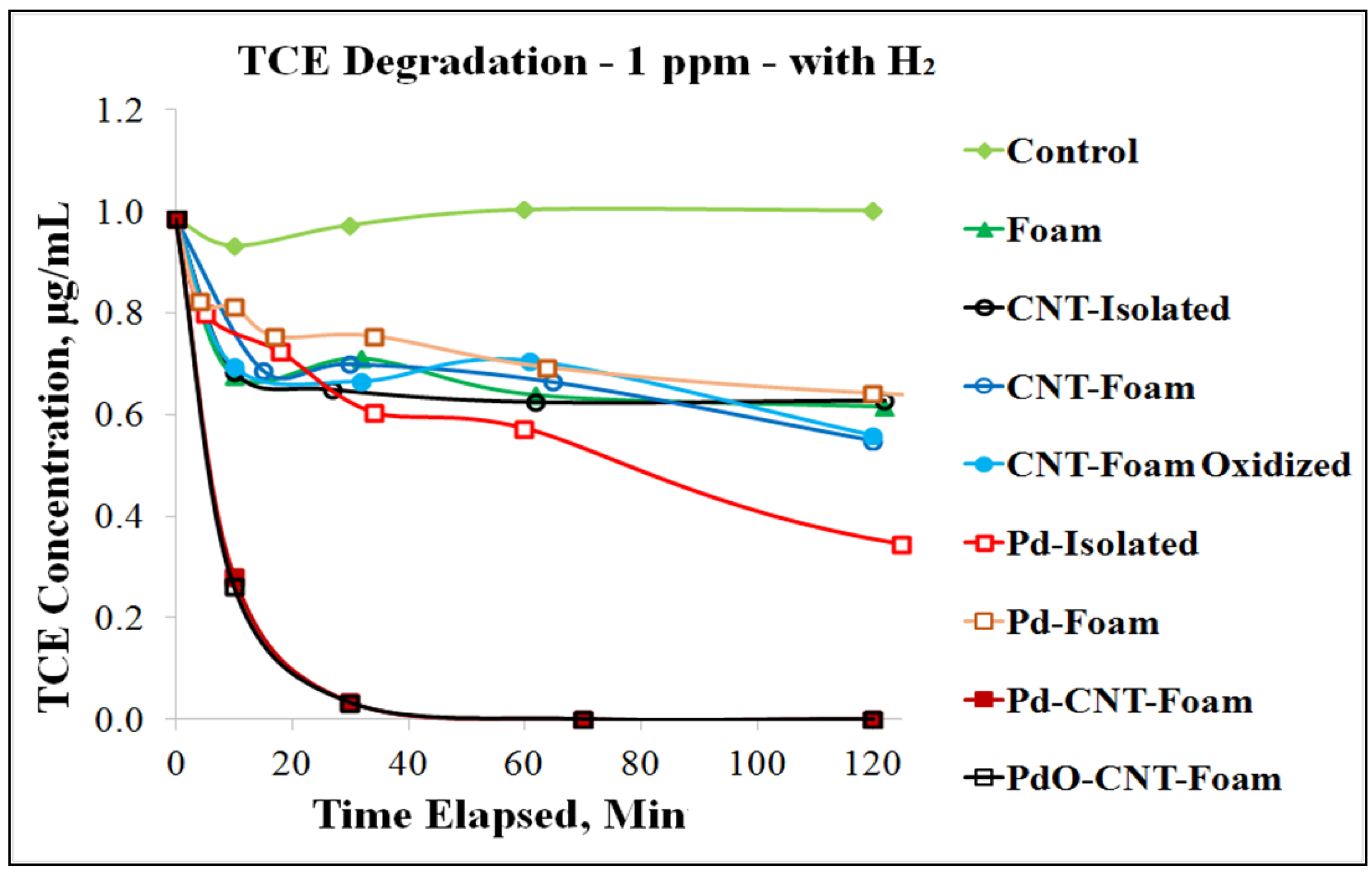 Palladium (Pd) and Palladium Oxide (PdO) nanoparticles were dispersed in the hierarchical format above and found to completely remediate TCE at low concentrations (Figure 10). Also notable is that Pd on the porous carbon substrate by itself has comparable or lower degradation efficiency as isolated Pd by itself. However, Pd on the hierarchical format (attached to CNT forests on the foam) shows significantly higher degradation efficiency than all other materials and combinations tested. This demonstrates the large increase in catalytic availability through hierarchical ordering.