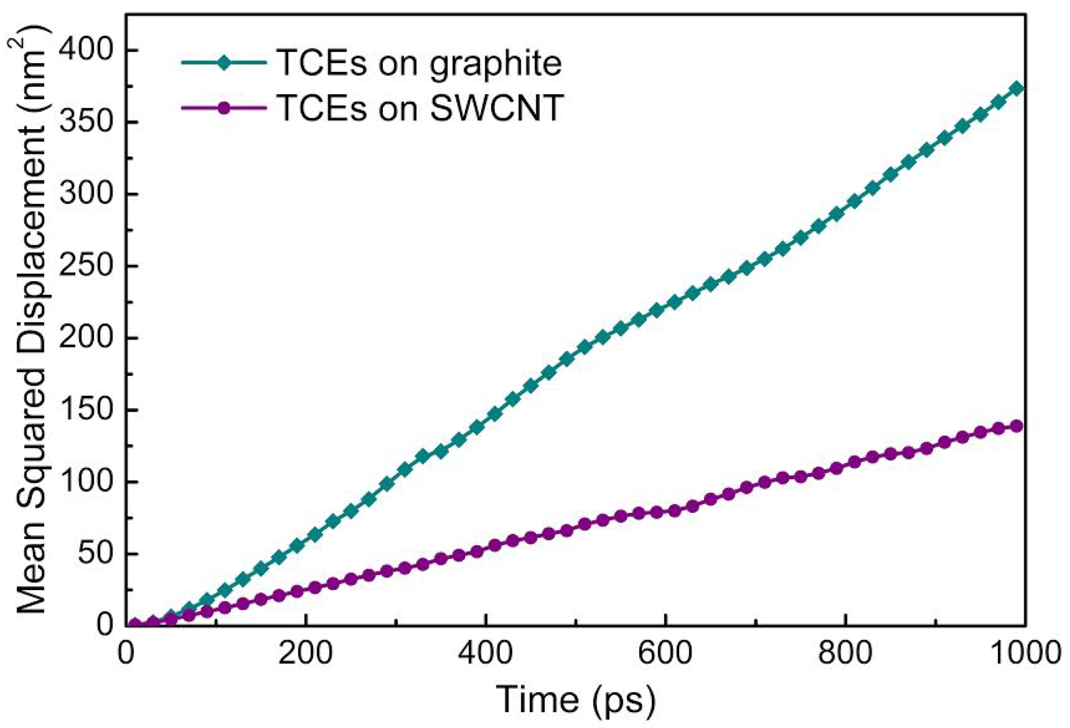 Mean-squared displacement of TCE molecules on SWCNTs and graphite at room temperature.