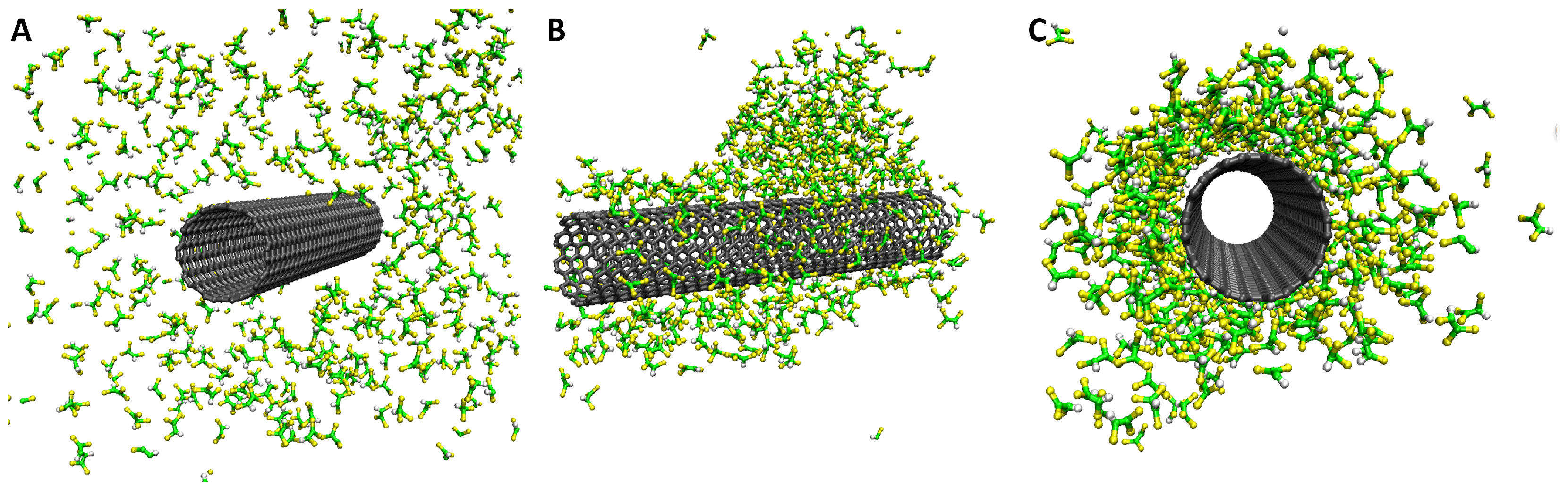 Snapshots showing adsorption of TCE on SWCNTs for the simulations carried out in the current work. A distinct monolayer forms from the (A) intial random to (C) packed conformation. There is a transition to a droplet shaped adsorption shown in (B).