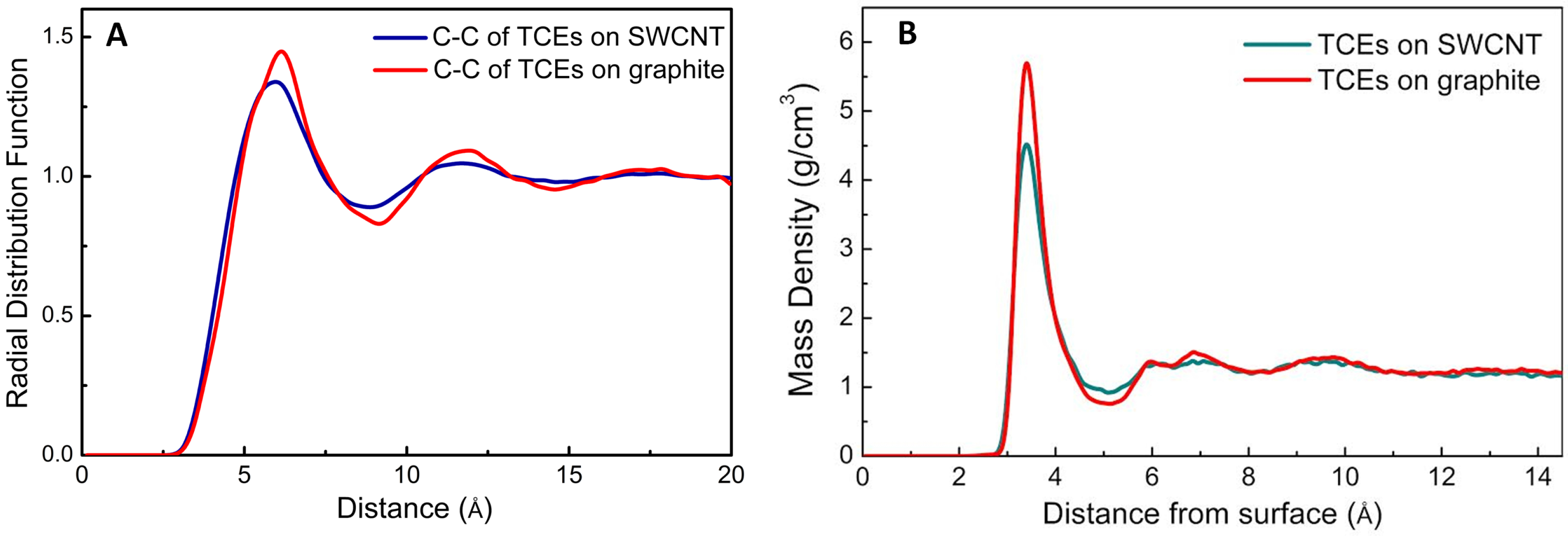 Profiles of (A) C-C radial distribution and (B) mass density for TCE adsorption on graphite and SWCNTs under study.