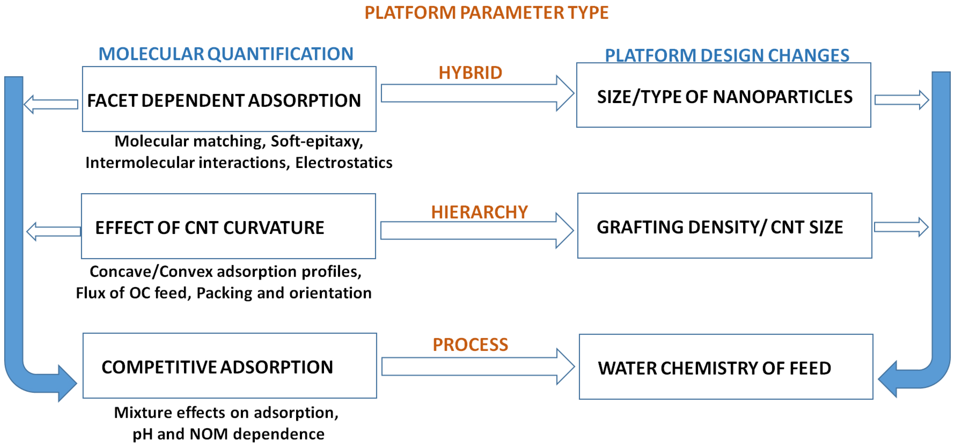 Composite membranes and hierarchies, with changes in the nature of dispersed nanoparticles and fillers, allow for a combinatorial approach to remediation. To effectively harness the possibilities offered by various combinations of hybrid hierarchies towards design of highly efficient remediation platforms, the mechanistic interplay of relative interactions must be isolated for each design parameter (Figure 15). For example, using the hierarchical approach by Mukhopadhyay et al., it needs to be understood if and how the degradation of TCE and other chloro organics such as trichloro alkane may follow different pathways, depending upon water chemistry, percolation rates, nanoparticle morphologies and size distribution. With change in the size and distribution of NPs, the relative % of facets would vary. Facet specific adsorption is known to occur for organics on metal hybrids [80,81,82,83,84]. The orientation and site adsorption contours, with variation in facet distribution, would change the nature of COC adsorption (hence remediation) for a given molecular structure. Hence, COC with hierarchies would allow a high level of control in groundwater remediation for a given set of contaminants. Both adsorption on CNTs and nanoparticles for a range of COCs are currently under investigation in our research group.