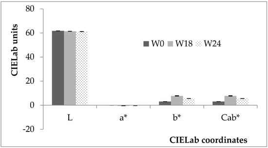 Wine colour differences perceived by the human eye (ΔEab*) [12] were calculated as the Euclidean distance between two points in the three-dimensional space defined by L, a* and b*. For all analysed wines, ΔEab* values were significantly greater than 2 (p < 0.05). The highest value of ΔEab* was found between W0 and W18 (ΔEab* = 4.8 ± 0.9), which was higher than three units, indicating that the colour difference between these samples can be easily detected by the observer. Besides, the difference between W18 and W24 samples (2.2 ± 0.9, respectively) was less than three units, making it difficult for the observer to differentiate the colour of these wines.