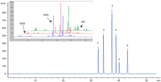 As expected, the highest amount of phenolic acids was found in macerated wines, according to the following order: W18 > W24 > W0 (Table 3). W18 samples showed a total phenolic acid content (TFAC) about two times higher than that of the other wines. Regarding the different phenolic acid classes analysed, the total content of HCAs was higher than that of HBAs for all the wines. Maceration led to a higher content of HCAs in the wine regardless of the skin contact time. Moreover, while W18 showed an increase of both HCA and HAB contents compared to that of W0 samples, prolonged skin contact time up to 24 h produced a strong reduction of HBA content (−42%) in W18 samples [12]. The higher content of HCAs of macerated wines agreed with spectral analysis (i.e., CIELab coordinates and 420 nm absorbance values) as previous studies demonstrated that HCAs can be both oxidation substrates and browning precursors, accounting for the higher oxidation potential of wines undergoing a long skin contact time [14]. Results also showed a decrease in almost all phenolic acids analysed with the increasing skin contact time. This can be explained taking into account that oxidative processes play a significant role in changing the phenolic composition of wine since they are accompanied by the oligomerization of the original phenolic compounds.
