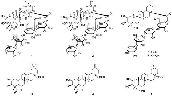 - Iwanaga, S.; Warashina, T.; Miyase, T. Triterpene saponins from the pericarps of Akebia trifoliata. Chem. Pharm. Bull. 2012, 60, 1264–1274. [Google Scholar] [CrossRef] [PubMed]