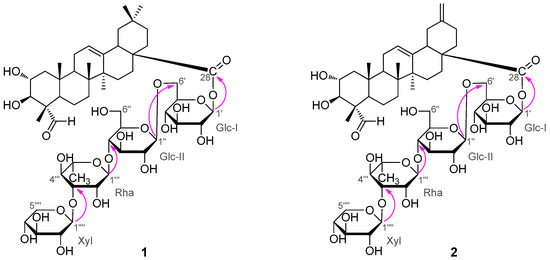 Compound 1 was obtained as a white, amorphous powder. Its (−)- and (+)-ESI-MS displayed quasi-molecular ion peaks at m/z 1087 [M − H]− and 1111 [M + Na]+, respectively, corresponding to the molecular formula of C53H84O23, which was confirmed by further HR-ESI-MS (+) analysis ([M + Na]+ m/z 1111.5297, calcd. 1111.5296). The 1H- and 13C-NMR spectra of 1 exhibited four sugar anomeric protons at δH 6.22 (Glc-I-1), 4.95 (Glc-II-1), 5.87 (Rha-1), and 5.24 (Xyl-1) (Table 1), and anomeric carbons at δC 95.5, 104.7, 102.2 and 107.1 (Table 2), suggesting the existence of four sugar moieties in the molecule. Acid hydrolysis of 1 with 2N HCl afforded d-glucose, l-rhamnose and d-xylose in the ratio of 2:1:1, which were identified by GC-MS analysis of their chiral derivatives (see experimental part). The 1H- and 13C-NMR assignments (Table 1 and Table 2) of the sugar moieties in 1 were established by interpretation of combined HSQC and HMBC data (See the Supplementary Materials). After having excluded the resonances due to the sugar moieties, the remaining signals in the 1H-NMR spectrum for the aglycone unit of 1 were readily recognized for six tertiary methyls at δH 1.42 (3H, s), 1.20 (3H, s), 1.07 (3H, s), 1.04 (3H, s), 0.90 (3H, s) and 0.88 (3H, s), an olefinic proton at δH 5.40 (1H, t), two oxymethine protons at δH 4.21 (1H, m) and 4.04 (1H, d, J = 10.1 Hz), and an aldehyde proton at δH 9.61 (1H, s). The 13C-NMR spectrum indicated, besides the signals for the sugar moieties, 30 carbons for the aglycone unit, including six methyls, nine methylenes, six methines (including an olefinic methine at δC 122.4, two oxygenated methines at δC 67.9 and 76.9 and an aldehyde carbon at δC 206.3), and nine quaternary carbons (including an olefinic carbon at δC 144.0 and a carbonyl carbon at δC 176.3). By comparison, it was found that the 1H- and 13C-NMR spectroscopic data (Table 1 and Table 2) of the aglycone of 1 were closely related to those of 2α,3β-dihydroxy-23-oxo-olean-12-en-28-oic acid [11], a known triterpene which was also obtained in this study as 5, with the major difference of the chemical shift value of the carboxyl group at C-28 was shifted from δC 180.0 in 5 to δC 176.3 in 1. These findings supported the fact that 1, as shown in Figure 1, was a monodesmoside saponin of 5 with an oligosaccharide chain linked at C-28 [12]. This deduction was consistent with the molecular formula of 1, and further in complete accordance with the 2D NMR spectroscopic data. In the HMBC spectrum, 1H-13C long-range correlation of H-1′ (δH 6.22) with C-28 (δC 176.3) was exhibited, which evidenced the glycoside linkage of Glc-I at C-1′ with the aglycone at C-28. The observation of HMBC correlations of H-1″ (δH 4.95) with C-6′ (δC 69.0), of H-1″′ (δH 5.87) with C-5″ (δC 77.0), and of H-1″″ (δH 5.24) with C-3″′ (δC 83.0) confirmed the sugar sequence as shown in Figure 2. The β-anomeric configuration of the d-glucose (Glc-I and Glc-II) and the xylose (Xyl) moieties were determined on the basis of their coupling constants of 3JH1′,H2′ (8.1 Hz), 3JH1″,H2″ (7.8 Hz) and 3JH1″″,H2″″ (7.5 Hz), respectively [12,13].