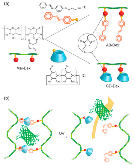 (a) Preparation of azobenzene-modified dextran (AB–Dex) and cyclodextrin-modified dextran (CD-Dex) through the thiol–maleimide reaction; (b) Schematic representation of photoresponsive protein release from the gel composed of trans AB–Dex and CD–Dex. Upon UV light irradiation azobenzene moieties isomerise from trans to cis configurations, resulting in the dissociation of crosslinking points, and allowing the entrapped protein to migrate into the media [51]. (Reproduced from Peng et al. [51] with permission of The Royal Society of Chemistry.)