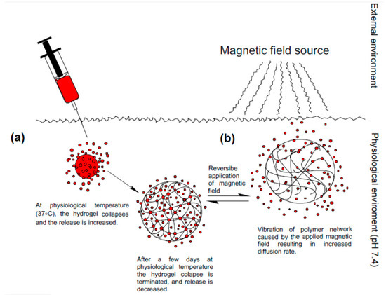 Multi-stimuli responsive drug delivery systems enhance sustained delivery by synergistically acting on the system resulting in a more improved control of release. These can involve a combination of materials that are responsive to two or more stimuli. An example is a multi-stimuli responsive hydrogel designed by Casolaro and coworkers [60] that included pH, temperature and magnetic field as stimuli. Casolaro used α-amino acid residues, including l-valine, structurally similar to poly (N-isopropylacrylamide) (pNIP) to form vinyl polyectrolyte hydrogels. The external stimulation of the magnetic field, through the magnetic nanoparticles embedded into the hydrogel, directs the system to the specific target tissue for localized release and also induces local hyperthermia stimulating the thermo-responsive part of the system. The mechanism of protein release from the hydrogel is illustrated in Figure 2. At pH 7.4 chain complexation occurs enhancing the stability of the polymer chains. At 37 °C, the hydrogel collapses and the release is increased until the collapse is terminated after a few days and the release is decreased. After this, the magnetic field is applied which causes vibration of the hydrogel network accelerating diffusion rate. The magnetic field is suspected to increase hydrogel temperature stimulating the thermo-responsive NIP. A sustained release of the active drug >25 days was observed in the multi-responsive hydrogel. The release rate can be manipulated remotely through external triggers, either by increasing the magnetic field strength.