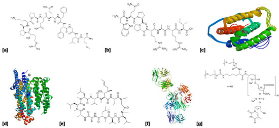 Structures of therapeutic proteins and peptides used in the treatment of ocular/ophthalmic disorders as discussed in Table 2 above. (a) Substance P; (b) Fibronectin; (c)Interferon α2a; (d) Interferon α2b; (e) Cyclosporine A; (f) Bevacizumab; (g) Pegaptinib.