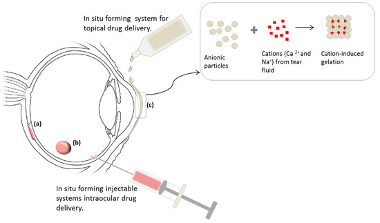 Schematic presentation of possible ocular routes for administration of stimuli responsive drug delivery systems. (a) Suprachoroidal implantation, injected as liquid and solidifying in contact with stimuli (e.g., temperature, pH); (b) Intravitreal implant which is also injectable and (c) Topical eye drops that gel when in contact with the eye due to pH and/or temperature.
