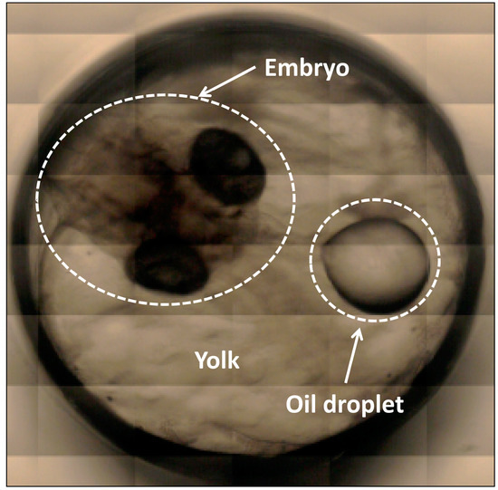 Male and female medaka (O. latipes) fish were bred in fresh water at 25 °C, and were fed a commercial medaka fish feed. This fish species is often used as a laboratory model to test compounds for carcinogenicity [27,28]. The eggs produced were approximately 1.5 mm in diameter. They were transparent and suitable for the spectroscopic analysis. A standard egg hatches approximately two weeks after fertilization under normal feeding conditions [29,30]. In the unfertilized egg, a number of small oil droplets are visible, and soon after fertilization, the oil droplets that are distributed throughout the egg begin to coalesce and fuse into larger droplets. In regions where there are no large oil droplets present, cytoplasm accumulates to form a blastodisc and unequal cleavage takes place, which transforms into the embryonic body. The detailed development processes of this species are explained in ref. [29]. Figure 1 depicts an optical image showing a fertilized medaka egg on the fifth day after fertilization taken with a camera attached to a microscope at 5× magnification. On the day following fertilization, the embryonic body can easily be seen in the egg (Figure 1). The egg consists of three major parts: oil droplets, egg yolk, and embryo. The oil droplets are rich in lipids (unsaturated fatty acids), while the egg yolk contains both lipids and proteins [30,31]. The egg contains sufficient energy in the oil droplets and egg yolk to complete egg development until first feeding commences [32], with total lipid contents decreasing 30% during egg development [33]. The medaka eggs hatch approximately two weeks after fertilization, as mentioned previously; however, the period before hatching is variable. In the present study, the eggs hatched between 11 and 14 days after fertilization. Hence, it is necessary to define a method to be able to assign the data as being the previous day of hatching. In the majority of cases, the eggs spawned by one individual hatched on the same day. One egg was chosen from the eggs spawned by one individual and NIR measurement was performed. If the other eggs spawned by the same individual hatched on the next day after the original NIR measurement, the NIR data was assigned as JBH.