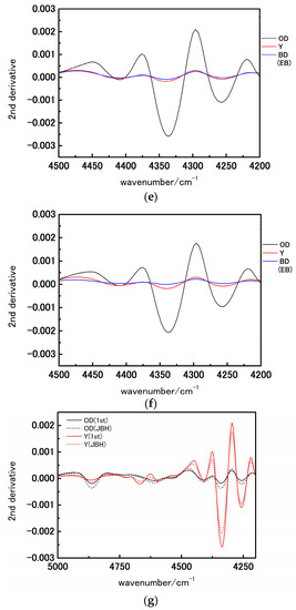 (a,b) NIR spectra in the 6200–4000 cm−1 region of the oil droplets, egg yolk, and blastodisc (embryonic body) on the fertilization day (first day) and day just before hatching (JBH); (c–f) are second derivatives of the spectra shown in Figure 2a,b in the 5500–4500 cm−1 and 4500–4200 cm−1 regions, respectively; (g) The overlay of the second derivative spectra in the 4900–4200 cm−1 region. (OD: oil droplets, Y: egg yolk, BD: blastodisc, EB: embryonic body).