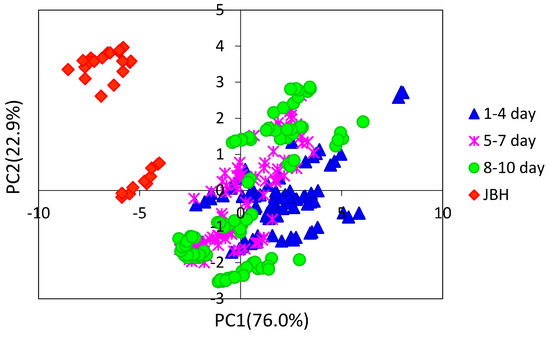 PC1 and PC2 score plot built using the NIR spectra of the egg yolk obtained in the period of the first day after fertilization to the day just before hatching (JBH).